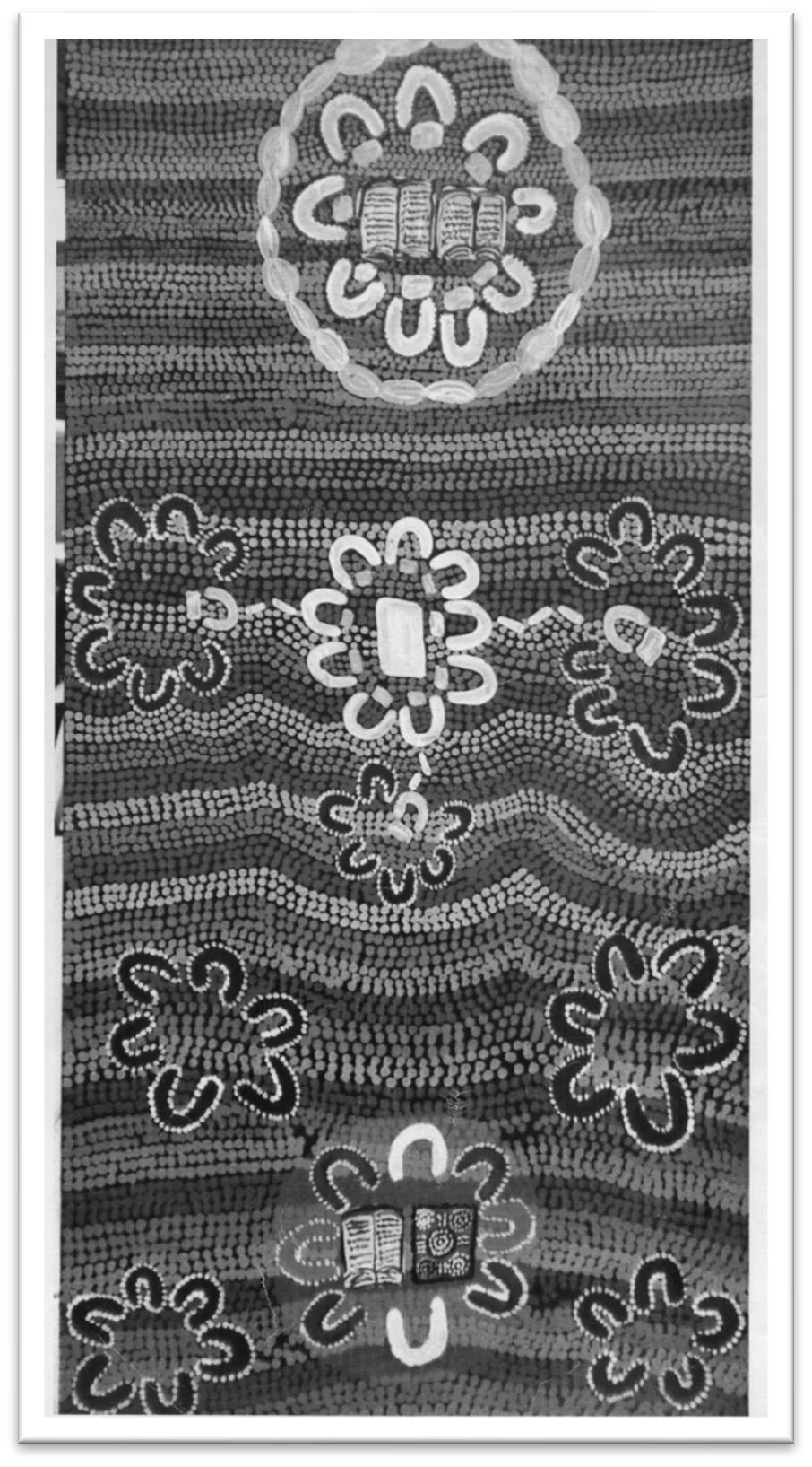 ‘White table’ sends white people to communities with white document. Each white person enters the circle of black people, taking positions of importance in centre of meetings. Back figures who have their own system of discussion and consensus in the circular kin-based pattern.Two way pattern includes people – white, brown (i.e., mixed language speakers) and black – all in a circle with two cultural formats of the business – paper and painting – two ways of thinking on issues at hand. After consensus the message is carried home to communities. You see the black figures travelling home – maybe to Kintore or Yuendumu. The message is carried in the language of local people. Two way work. Language work.