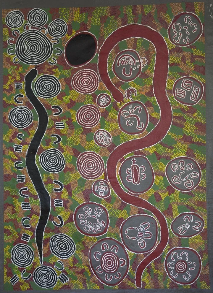 The double snakes was painted not long after the Royal Flying Doctor remote mental health team (for whom I worked) were discussing the case of a highly intelligent, yet troubled 14 year old boy. Japaljarri agreed to come with me to the community to observe and speak with this boy.