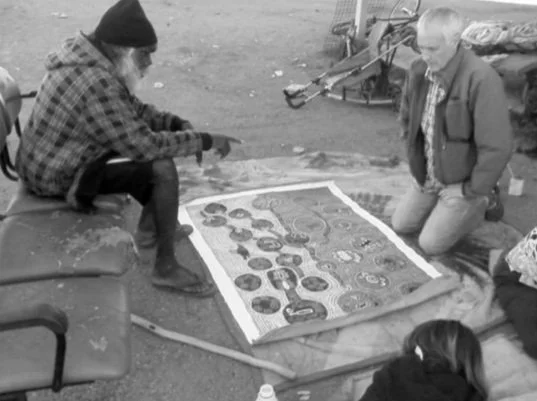 Two men – on the ground – a town camp –- Alice Springs. The one, a psychiatrist, Dr Marcus. The other, Japaljarri Spencer. The painting is one of several by Japaljarri, a Warlpiri-Pintubi man known for depicting, in Warlpiri iconography, the existential conditions of Aboriginal people in our region.